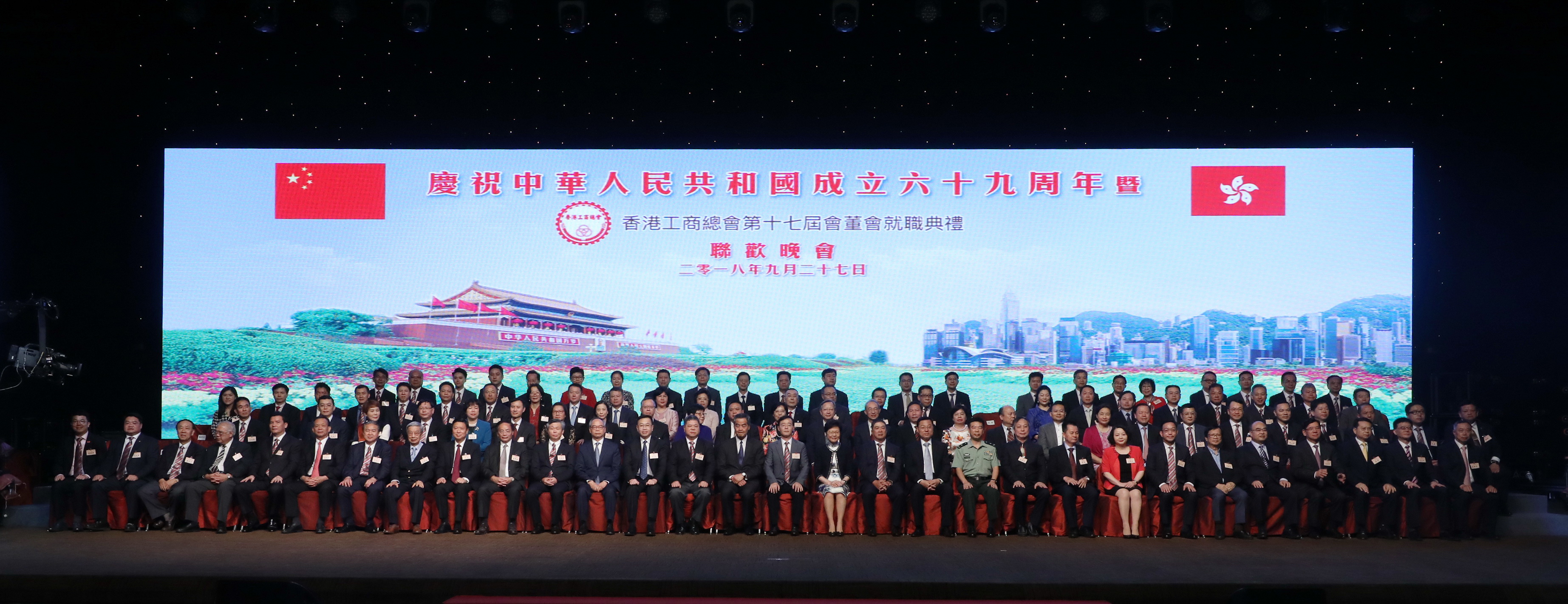 本网讯 9月27日,我办副主任何靖应邀出席庆祝中华人民共和国成立69周年暨香港工商总会第17届会董会及筑福香港基金会第2届理事会就职典礼联欢晚会,并与全国政协副主席梁振英、香港特区行政长官林郑月娥、外交部驻港特派员公署特派员谢锋、解放军驻港部队副司令员田永江等共同担任主礼嘉宾。香港社会各界近2000人出席晚会。