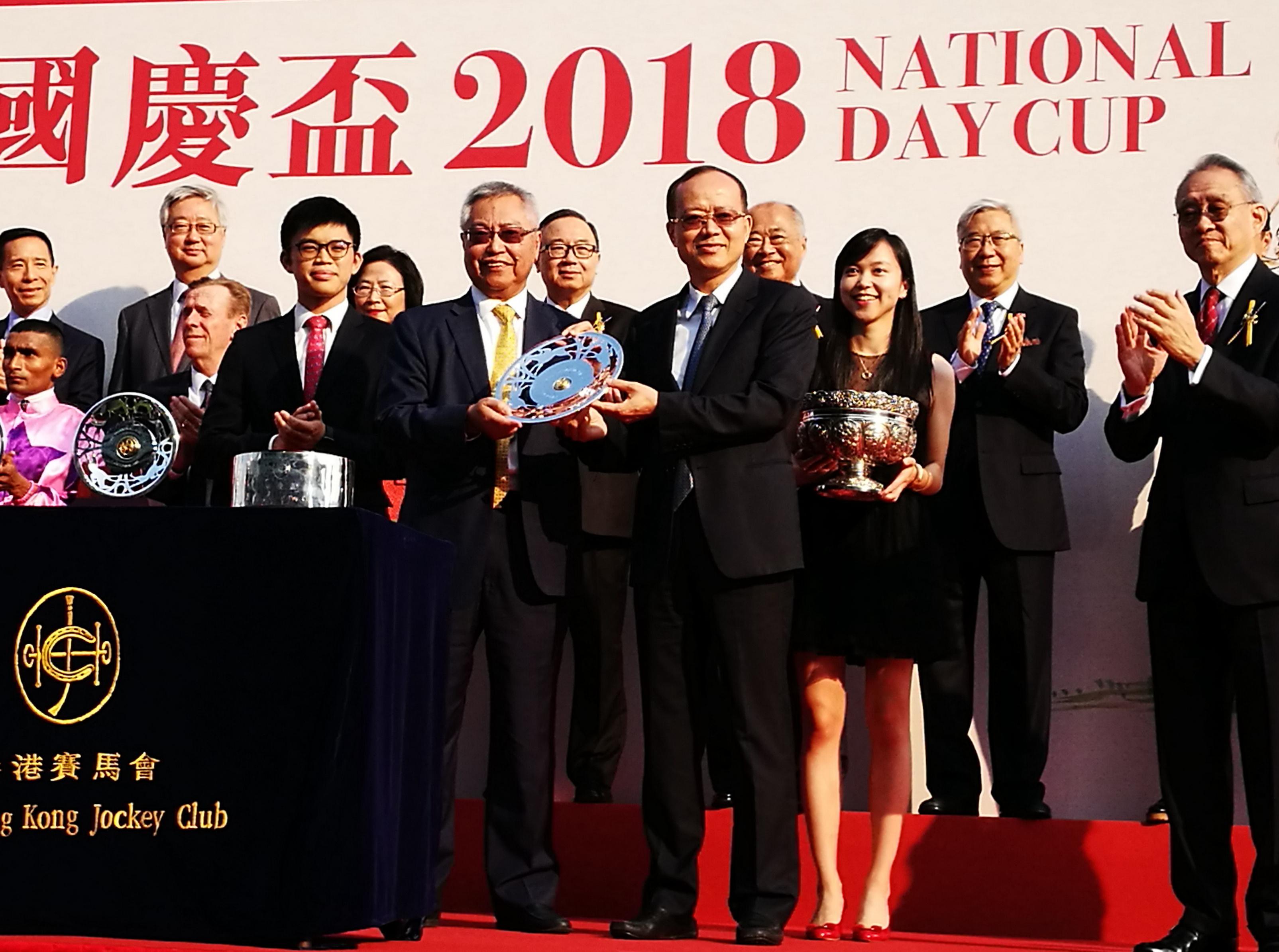 本网讯 10月1日下午,香港赛马会庆祝中华人民共和国成立69周年赛马活动在沙田马场举行。我办副主任杨健应邀出席活动并为“国庆杯”赛事颁奖。
