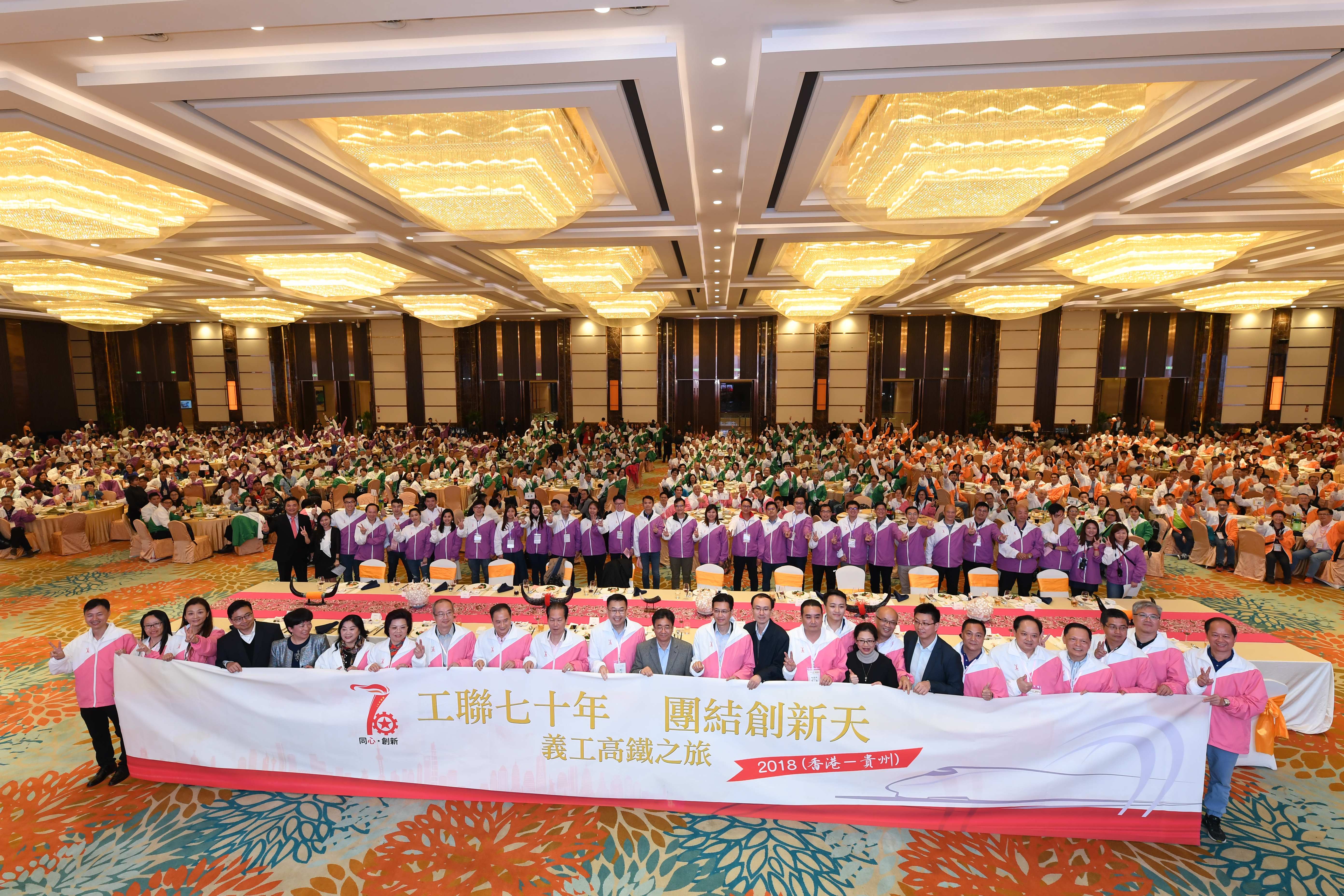 贵州省副省长魏国楠会见了吴秋北团长及义工代表,并出席了义工大集结联欢晚会,向大家介绍了贵州省社会经济发展情况特别是党的十八大以来贵州省各项事业大踏步前进所取得的成就。何靖在联欢晚会致辞中对贵州省委省政府的高度重视和大力支持表示衷心感谢,对工联会义工朋友们长期以来的辛勤付出和默默奉献表示崇高敬意,并希望工联会一要不忘初心,秉承传统;二要发展力量,迎接挑战;三要改革创新,再创辉煌。这是工联会为庆祝成立70周年组织的系列活动之一,也是工联会义工队伍的一次大集结,共有1100余名义工参加此次活动。