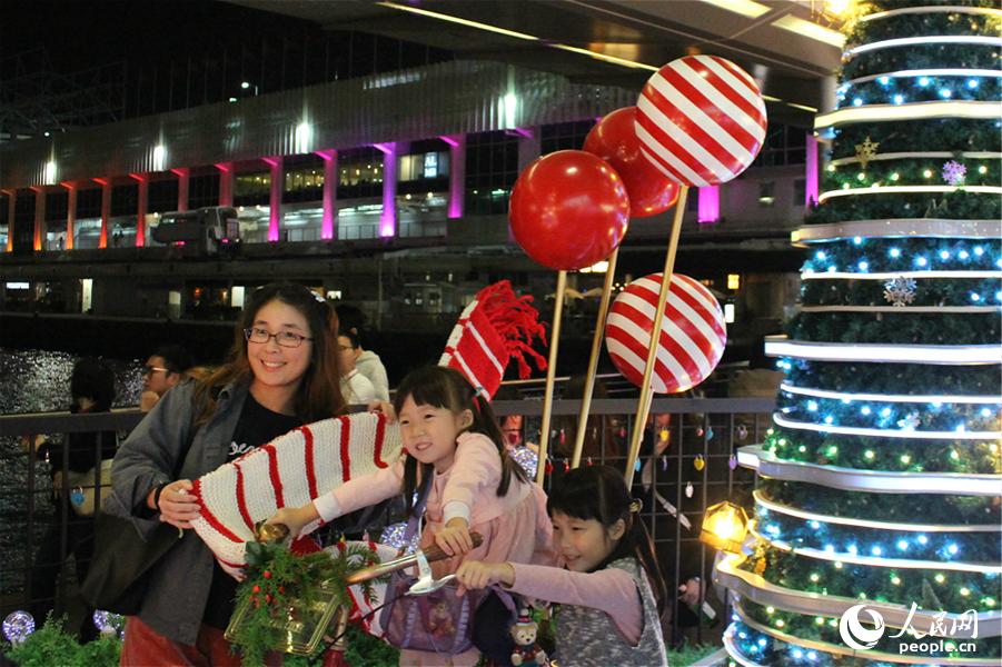 一家大小齐出动,记录下圣诞的美丽灯火。(吴玉洁 摄)