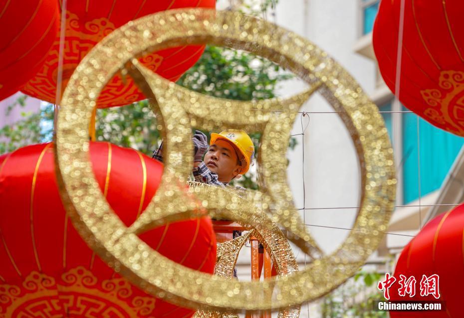 1月27日,农历新年临近,香港街头喜庆气氛越来越浓。工人正在湾仔利东街安装寓意圆满的红灯笼和金光闪闪的金钱。整条步行街上方总共将悬挂668个灯笼和238个金钱,谐音“路路发”和“易发”。中新社记者 张炜 摄