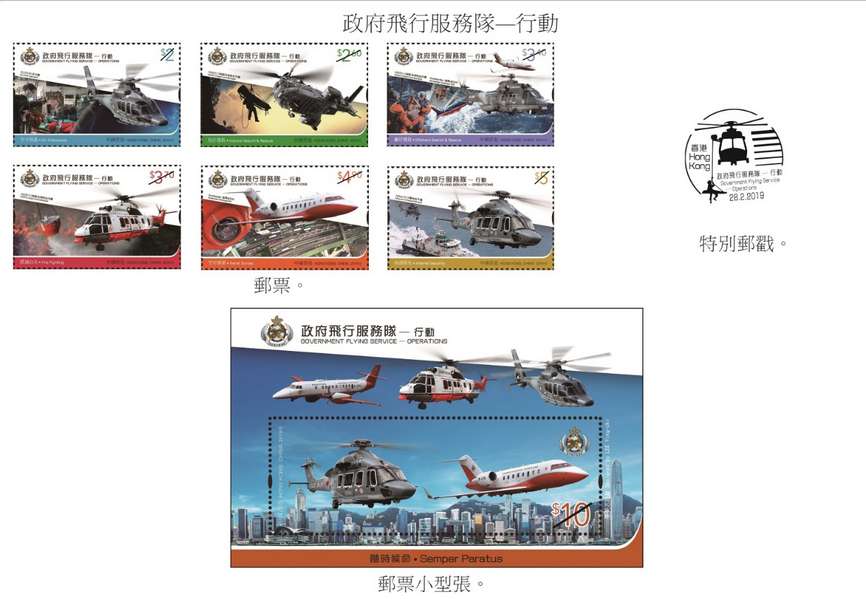 香港邮政将于2月28日发售一套以“政府飞行服务队──行动”为题的特别邮票及相关集邮品,包括一套六枚的邮票及一张邮票小型张。各邮政局将由2月14日起发售正式首日封,每个售价1.3元。以上邮票及相关集邮品同日起在邮政总局、尖沙咀邮政局、荃湾邮政局、沙田中央邮政局和屯门中央邮政局展出。此外,各集邮局将于2月14日至20日期间接受预约自备封盖销服务。