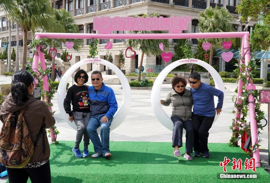 2月14日情人节,两队中老年夫妇在香港赤柱广场的“甜蜜浪漫秋千”上拍照留念。情人节不光是年轻人的节日,也是中老年人重温浪漫的日子。中新社记者 张炜 摄
