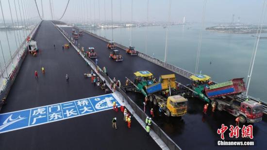 资料图:1月30日,粤港澳大湾区又一重要过江通道虎门二桥项目的两座主桥钢桥面环氧沥青铺装工程完成,预计今年5月1日前通车。中新社发 岳路建 摄