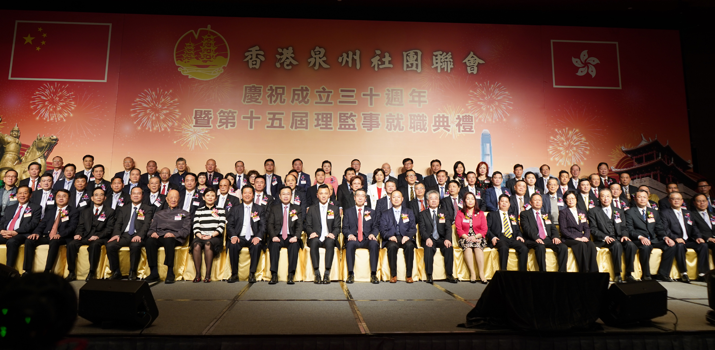 本网讯 3月17日,我办副主任何靖应邀出席香港泉州社团联会成立三十周年暨第十五届理监事就职典礼,并与外交部驻港特派员公署副特派员赵建凯、福建泉州市人大常委会副主任吴友才及香港福建社团联会主席吴换炎、泉州社团联会会长陈祖恒等共同主礼。香港社会各界人士及泉州在港乡亲近1000人出席活动。