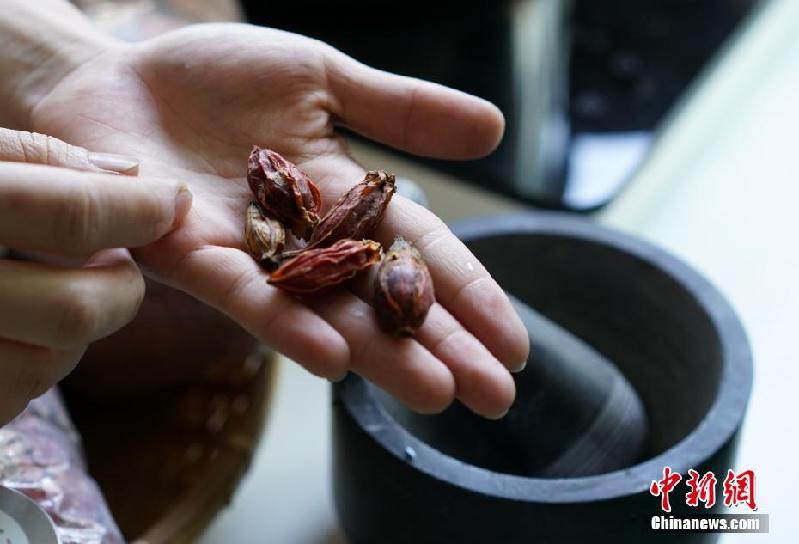 染乐工房创始人张骏霖介绍说,染房使用的原料是天然食材,而且这些食材一般是街市废弃的剩菜或失去食用价值的次品食材。中新社记者 张炜 摄