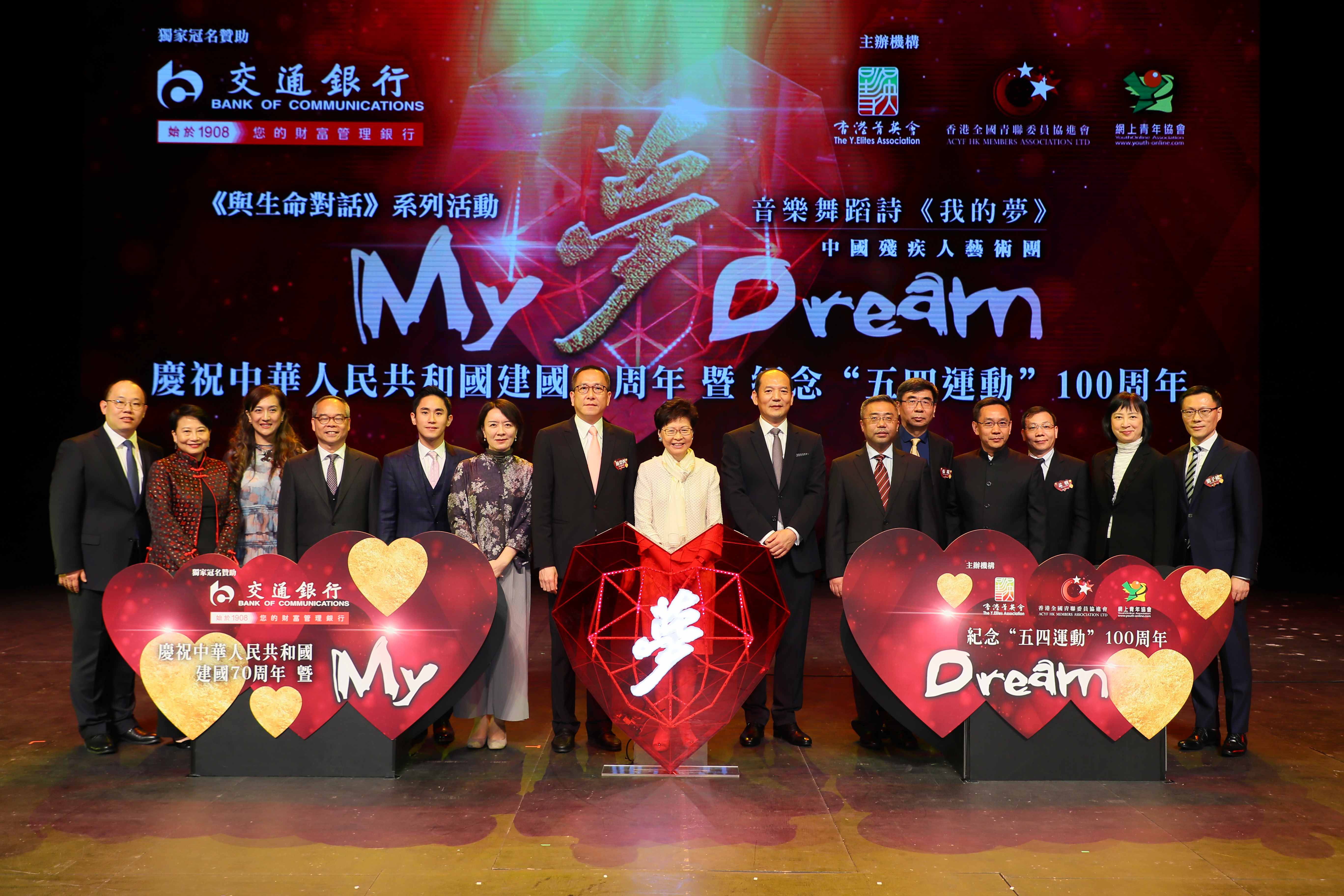 本网讯 4月4日晚,中国残疾人艺术团音乐舞蹈诗《我的梦》公益演出在香港文化中心举行。我办副主任卢新宁与香港特区行政长官林郑月娥共同主礼,并与近1500名社会各界人士一起观看了演出。