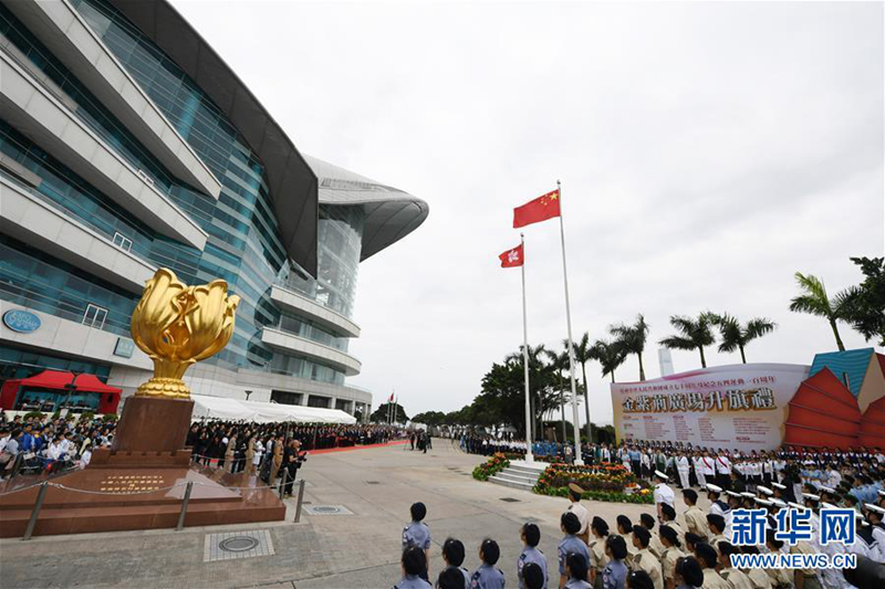 5月4日拍摄的升旗仪式现场。当日,香港金紫荆广场气氛庄严。超过2000名来自香港和内地的青少年及各界人士会聚于此,参加隆重的升旗仪式,庆祝新中国成立70周年及纪念五四运动100周年。新华社记者 吕小炜 摄