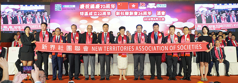 本网讯 6月11日,新界社团联会举行庆祝中华人民共和国成立70周年、香港特别行政区成立22周年暨新社联成立34周年会庆酒会。我办副主任何靖出席酒会,并与香港特区行政长官林郑月娥、外交部驻港特派员公署特派员谢锋、港区全国人大常委谭耀宗、特区政府民政事务局局长刘江华、民建联主席李慧琼等嘉宾共同主礼酒会。来自香港社会各界贤达、知名领袖、社团领袖逾900人出席酒会。