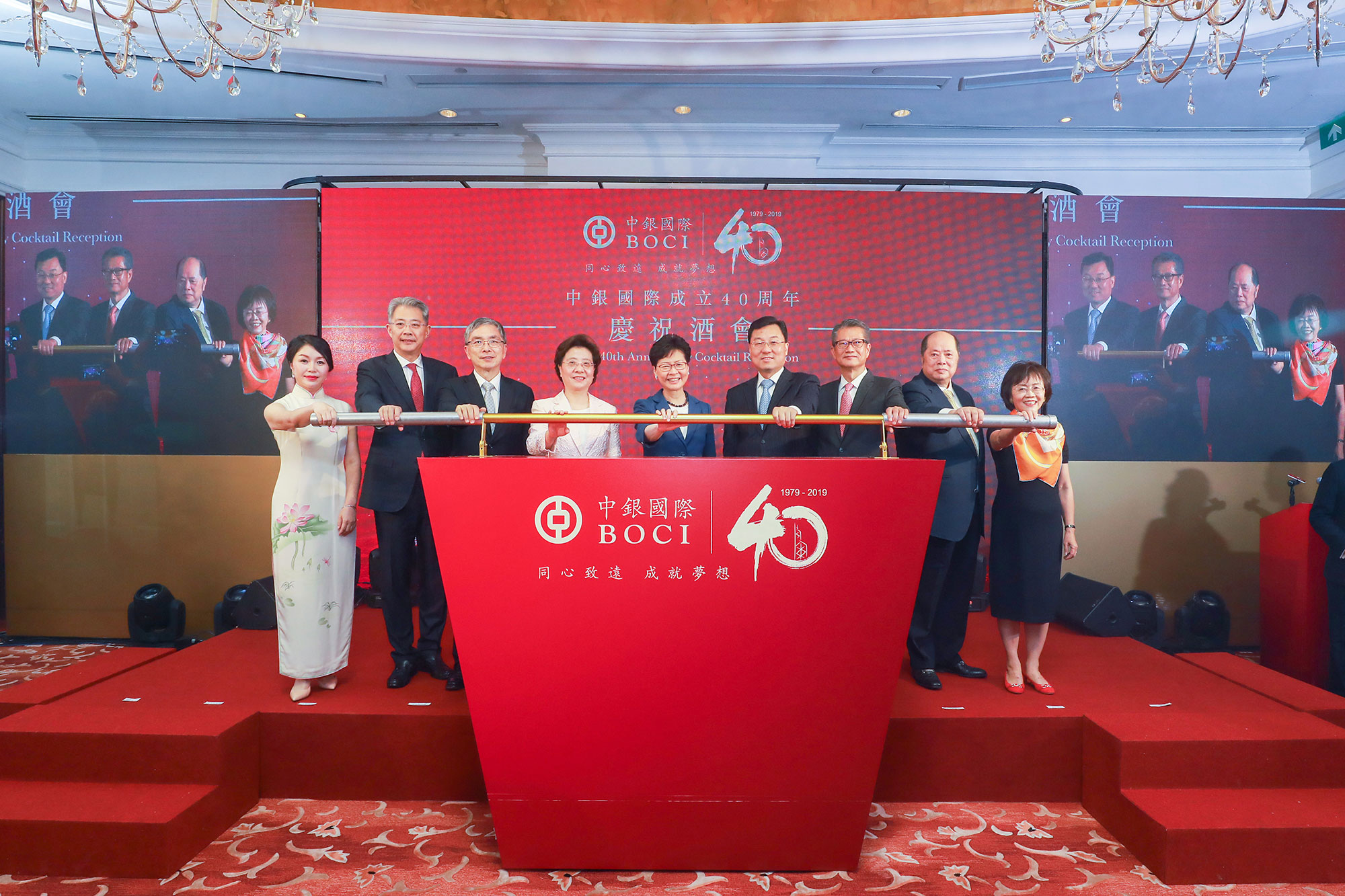 本网讯 6月10日,我办副主任仇鸿应邀出席中银国际成立40周年庆祝酒会,并与香港特区行政长官林郑月娥、外交部驻港特派员公署特派员谢锋、特区政府财政司司长陈茂波、中银国际首席执行官兼执行总裁李彤等共同主礼。逾200名香港政商界名人参加酒会。