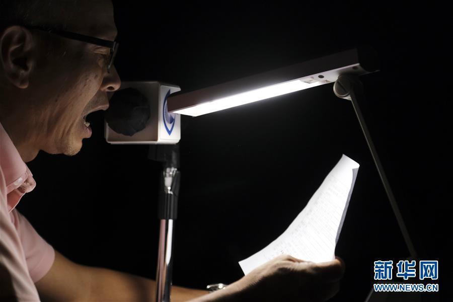 在香港盲人辅导会的一个小礼堂,口述影像员赖子全在口述电影(6月20日摄)。 新华社发(王申 摄)