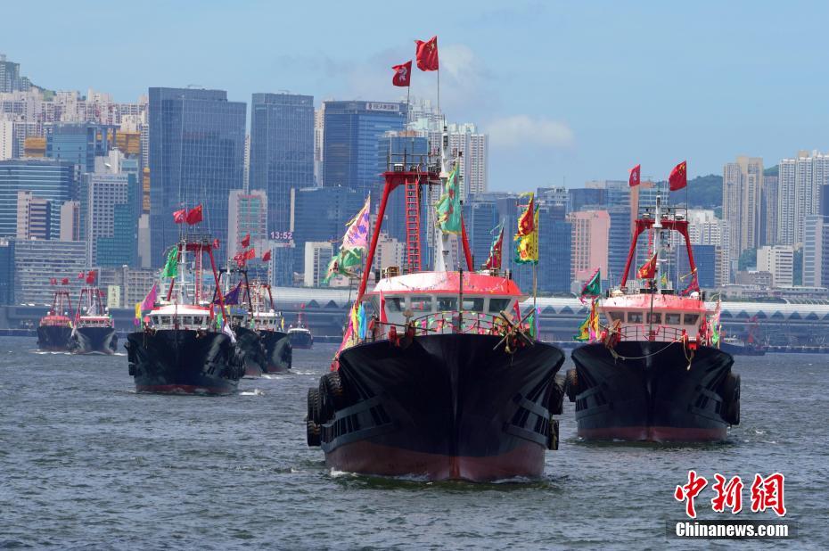 7月1日下午,香港渔民在维多利亚港举行庆祝香港回归祖国22周年渔船巡游活动。来自香港仔、筲箕湾、屯门和长洲的70艘渔船,悬挂中华人民共和国国旗和香港特别行政区区旗环绕维多利亚港进行巡游。中新社记者 张炜 摄