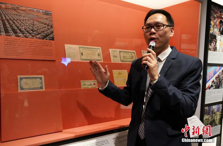 7月2日,香港庆祝中华人民共和国成立70周年重点活动——“现代化之路:共和国七十年”展览在香港历史博物馆举行开幕典礼,展览通过170件来自中国国家博物馆的馆藏和约40件香港历史博物馆的藏品,配合多媒体及视听节目,从政治、经济、科教、文化、民生等方面展现70年来中国现代化建设的伟大成就,让观众了解新中国成立70年来国家的进步和现代化进程,增进香港青少年对国家的认识。图为香港历史博物馆馆长张锐森介绍中国证券市场的开端,左侧是新中国第一张上市公司的股票“飞乐音响”。中新社记者 张炜 摄