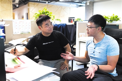 7月2日,冬奥组委办公室,黄博谦(右)和老师交谈,他是一个愿意表达想法的年轻人。