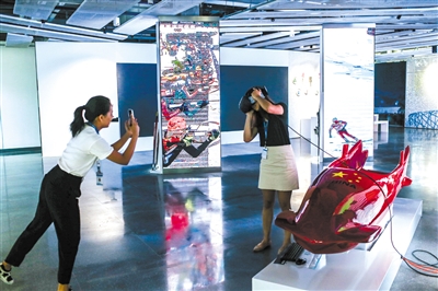 7月2日,冬奥组委展示厅,潘淑颖(右)体验VR雪车,关蓓欣赶忙给她拍照。