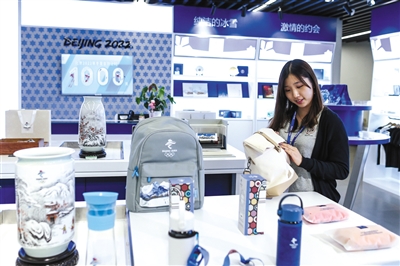 7月6日,冬奥组委特许商品商店,在市场部实习的梁芷君正协助整理商品。