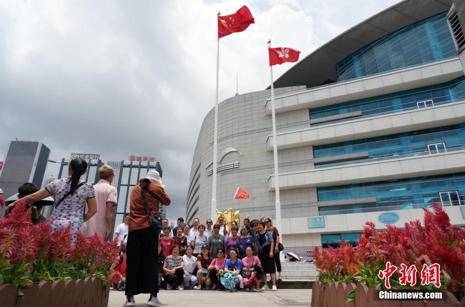 7月9日,众多中国内地游客在香港金紫荆广场观光拍照。随着暑期到来,香港旅游业预计将逐渐升温。中新社记者 张炜 摄