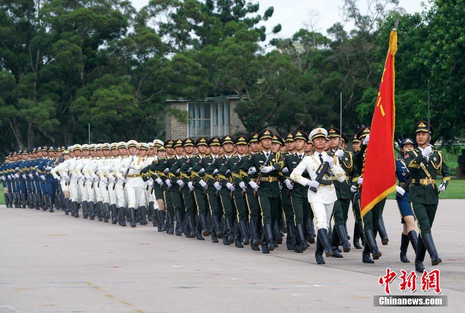 7月15日上午,第15届香港青少年军事夏令营在解放军驻香港部队新围军营举行开营典礼。来自香港100余所中学的600名青少年整齐列队,高举右手齐声宣誓入营。本届军事夏令营15日开营,28日结业,入营学生将在驻港部队官兵的指导下,在军营进行学习、训练和生活。自2005年7月推出青少年军事夏令营以来,累计有4300名香港青少年学生参加。图为在开营仪式上驻港部队三军仪仗队进行表演。中新社记者 张炜 摄
