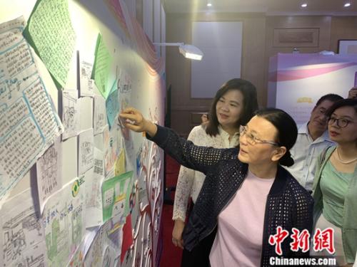 7月25日,港澳台大学生网信企业实习计划五周年分享会在北京举行。图为中国互联网发展基金会理事长马利参观分享会现场设立的2019年实习生纪念卡片展示区。中新社记者 杨程晨 摄