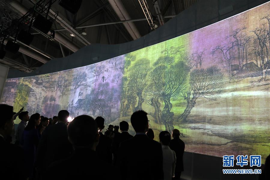 在展厅中央,一幅30余米长、近5米高的《清明上河图》“盛世长卷”巨幅动态高清投影映入眼帘(7月26日摄)。(新华社 吴晓初 摄)