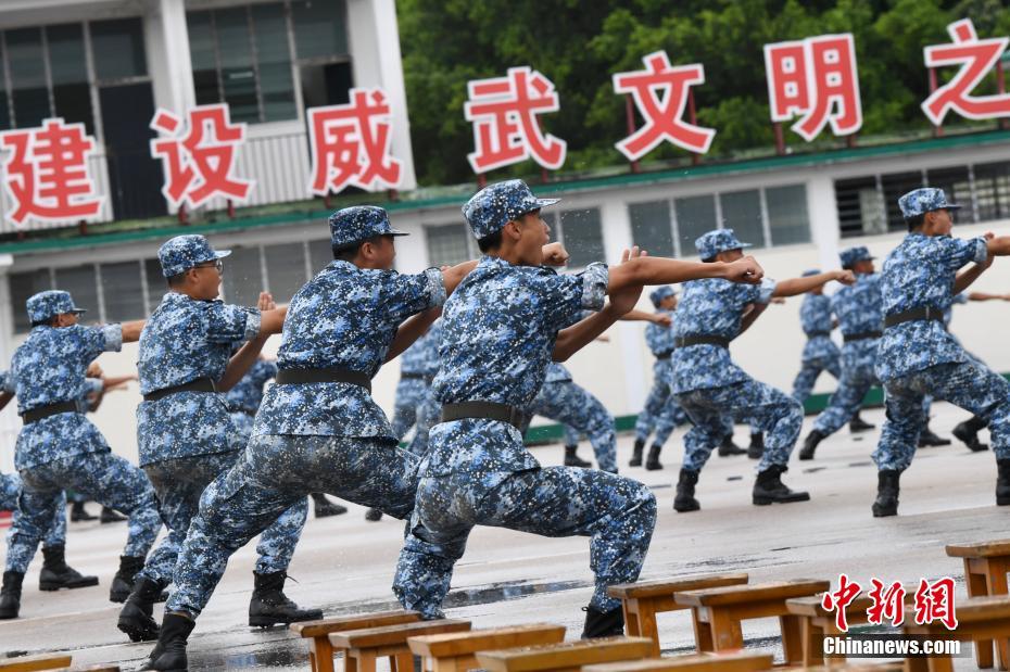 7月28日,学员岳家拳表演。当天,300名青少年穿着齐整的迷彩服集合在香港新围军营的操场上。学员们昂首挺胸列队进场,在庄严的升国旗仪式之后他们进行了岳家拳表演,用整齐的队形、熟练的动作、高昂的气势,向在场嘉宾和家长们展示过去半个月的训练成果。此届军事夏令营中,青少年营员们接受了体能训练、单个军人队列动作、战备基础、激光模拟对抗和地图使用等多项军事课目训练,参加了徒步行军、专题讲座、学唱歌曲、观看《致敬祖国》综艺演出等活动,分别赴昂船洲军营和石岗军营参观见学,度过了短暂而又充实的军营时光。(中新社 李志华 摄)