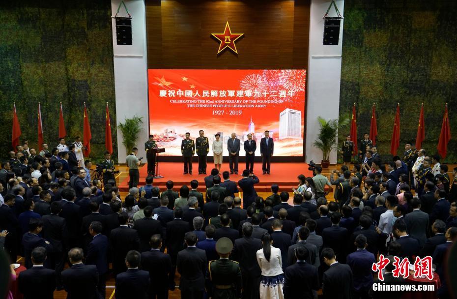 7月31日傍晚,解放军驻香港部队在中环军营举行招待会,隆重庆祝中国人民解放军建军92周年。全国政协副主席董建华(右三)、香港特别行政区行政长官林郑月娥(右四)、中央人民政府驻香港特别行政区联络办公室主任王志民(右二),外交部驻香港特别行政区特派员公署特派员谢锋(右一),驻香港部队司令员陈道祥(右五)、政治委员蔡永中(右六)等出席招待会并担任主礼嘉宾。(中新社 张炜 摄)