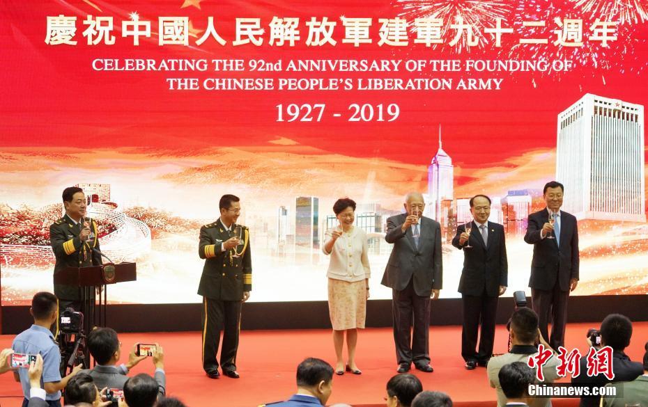 7月31日傍晚,解放军驻香港部队在中环军营举行招待会,隆重庆祝中国人民解放军建军92周年。全国政协副主席董建华(右三)、香港特别行政区行政长官林郑月娥(右四)、中央人民政府驻香港特别行政区联络办公室主任王志民(右二),外交部驻香港特别行政区特派员公署特派员谢锋(右一),驻香港部队司令员陈道祥(左一)、政治委员蔡永中(左二)等出席招待会并担任主礼嘉宾。(中新社 张炜 摄)