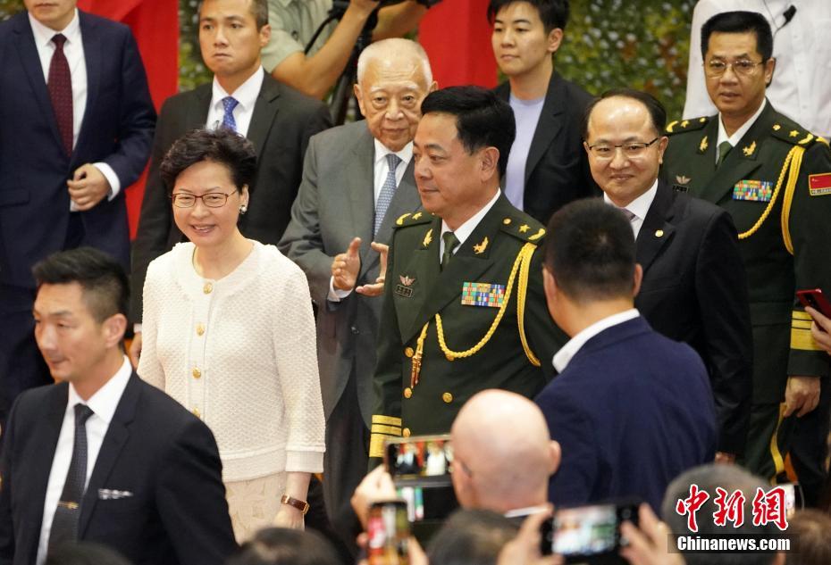 7月31日傍晚,解放军驻香港部队在中环军营举行招待会,隆重庆祝中国人民解放军建军92周年。图为全国政协副主席董建华、香港特别行政区行政长官林郑月娥、中央人民政府驻香港特别行政区联络办公室主任王志民、驻香港部队司令员陈道祥、政治委员蔡永中等出席招待会。(中新社 张炜 摄)