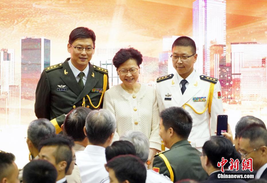 7月31日傍晚,解放军驻香港部队在中环军营举行招待会,隆重庆祝中国人民解放军建军92周年。图为招待会结束后驻港部队军官与香港特别行政区行政长官林郑月娥合影留念。
