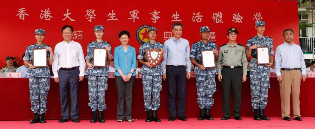 本网讯 8月11日,“第九届香港大学生军事生活体验营”结业典礼在新围军营举行。全国政协副主席梁振英、香港特区行政长官林郑月娥、驻港部队政委蔡永中、中央政府驻港联络办副主任陈冬、外交公署副特派员杨义瑞等共同主礼。结业礼上,学员们用整齐的队列、规范的军体拳和嘹亮的军歌表演,向现场数百位嘉宾和亲友展示了出色的训练成果,赢得了阵阵热烈的掌声。