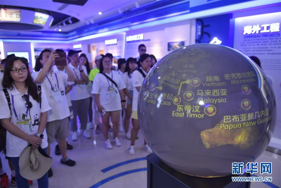 8月25日,参加交流活动的香港青年在中国中铁二院展厅内了解该企业在海外的工程项目。(新华社 刘坤 摄)