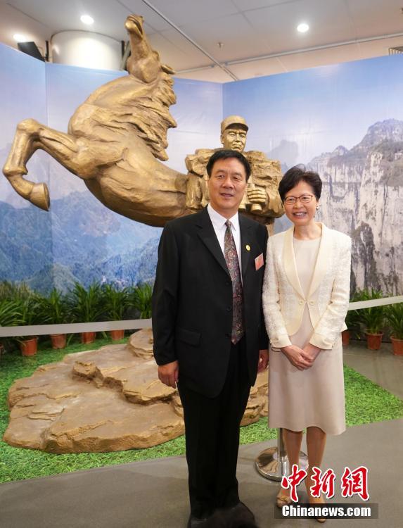 图为香港特区行政长官林郑月娥(右)与朱德之孙朱和平(左)在朱德铜像前合影留念。(中新社 张炜 摄)