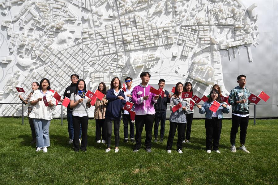 9月19日,在北京读书的香港学子在北京世园会香港园合唱歌曲《我和我的祖国》。 当日,2019年中国北京世界园艺博览会“香港日”活动在北京世园会园区举行。 新华社发(任超摄)