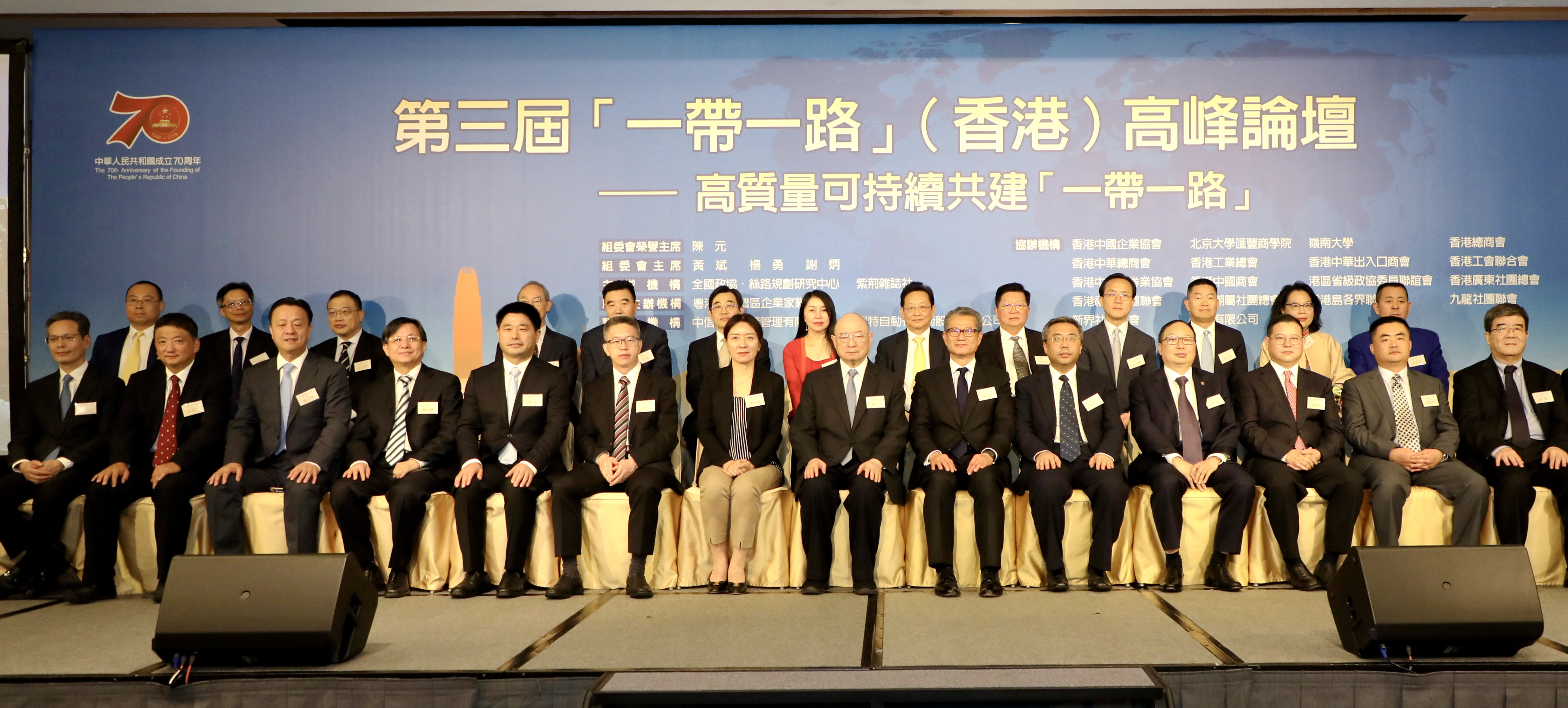 本网讯 11月5日下午,我办副主任卢新宁应邀出席“庆祝中华人民共和国成立七十周年暨第三届‘一带一路’(香港)高峰论坛”,并与十二届全国政协副主席陈元、特区政府财政司司长陈茂波、外交部驻港特派员公署副特派员杨义瑞等共同主礼。