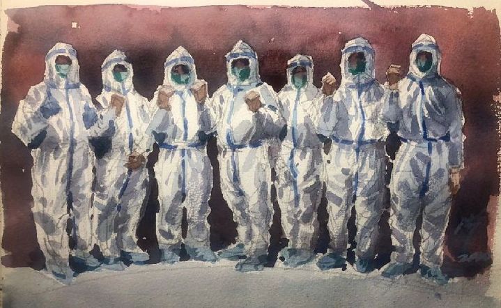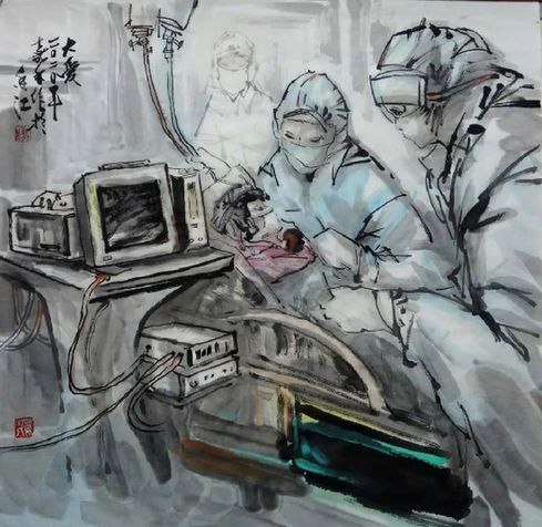 水彩作品:《众志成城》 作者:沉平(中国香港),香港美协顾问、香港水彩画研究会会长