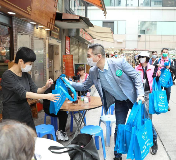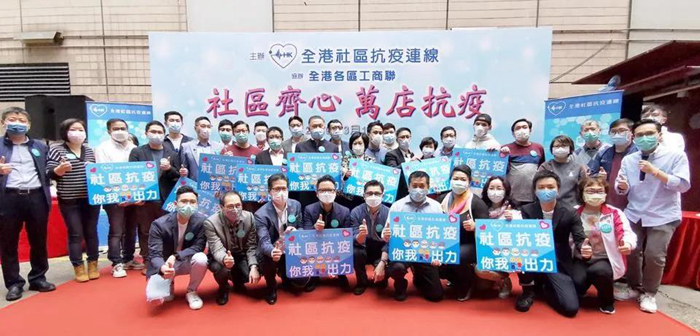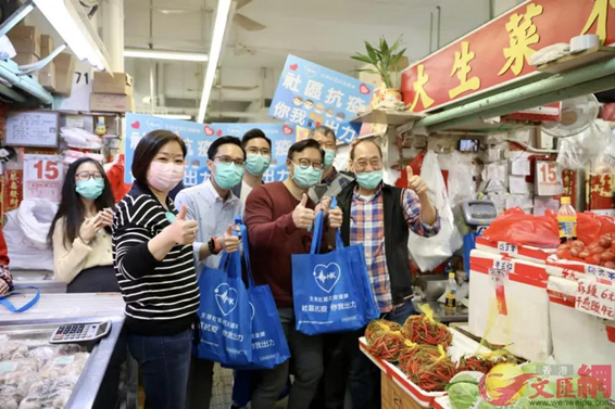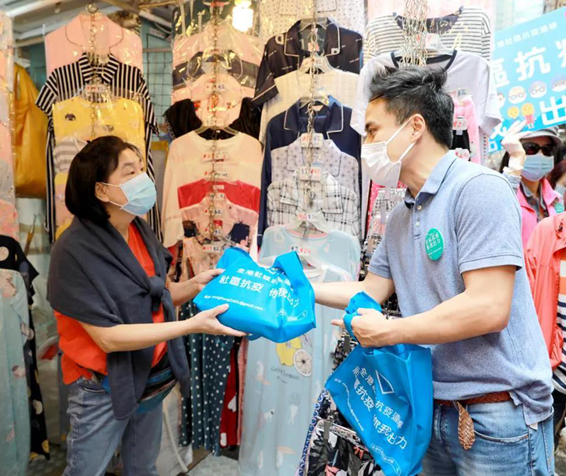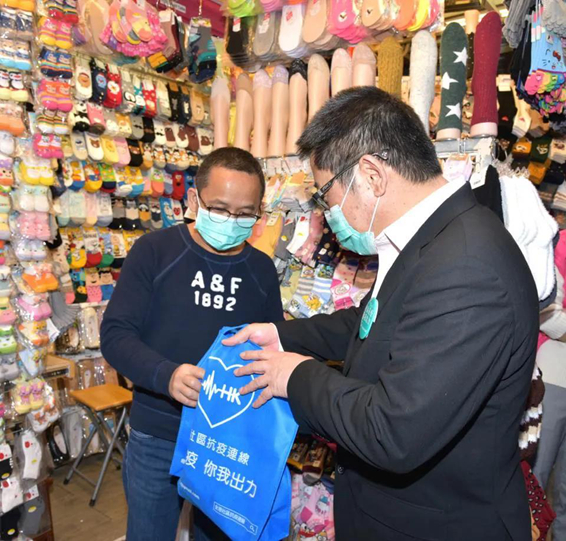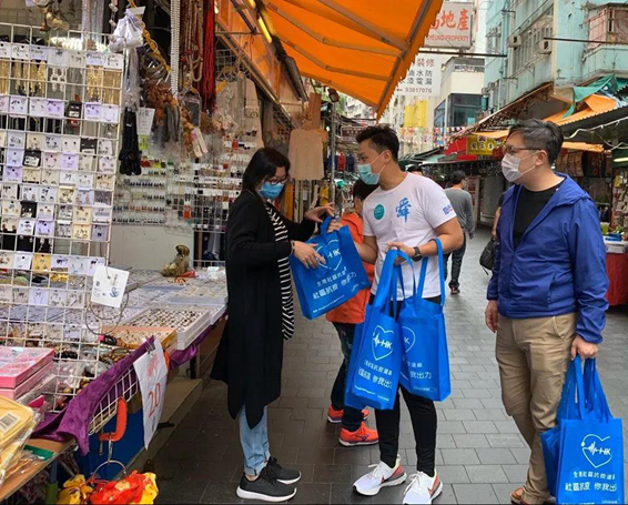 3月15日,“全港社区抗疫连线”联合全港各区工商联举行“社区齐心 万店抗疫”大行动,向全港18区2万多家商户派发抗疫物资爱心袋,共派出25万个口罩和2.5万支消毒搓手液,协助商户加强卫生防护。