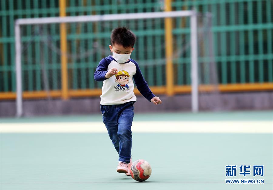 3月24日,在香港西湾河附近的运动场,小朋友在踢足球。 新冠肺炎疫情下,香港民众积极进行多种形式的体育运动。(新华社 李钢 摄)