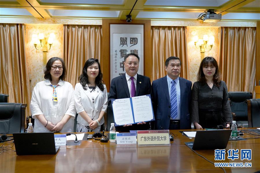 6月8日,广东外语外贸大学校长石佑启(中)展示签署后的合作协议书。(图片来源:新华社)