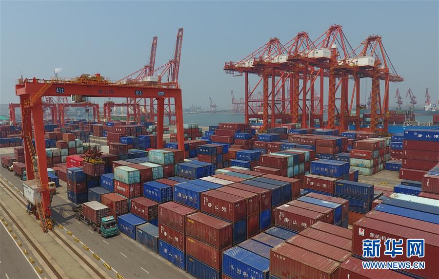 7月16日,国家统计局发布数据,初步核算,上半年国内生产总值456614亿元,按可比价格计算,同比下降1.6%。分季度看,一季度同比下降6.8%,二季度增长3.2%。这是工人在唐山港京唐港区集装箱货场操作机械设备调运集装箱(7月16日摄)。(新华社记者 杨世尧 摄)