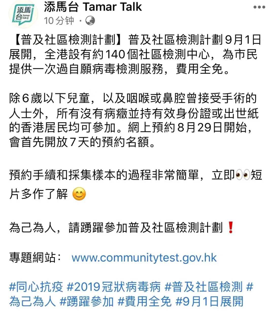 香港特区政府将于9月1日展开普及社区检测计划。除6岁以下儿童,以及咽喉或鼻腔曾接受手术的人士外,所有没有病症并持有效身份证或出生证明书的香港居民均可到社区检测中心进行免费检测。检测计划将于29日开始接受市民网上预约登记。