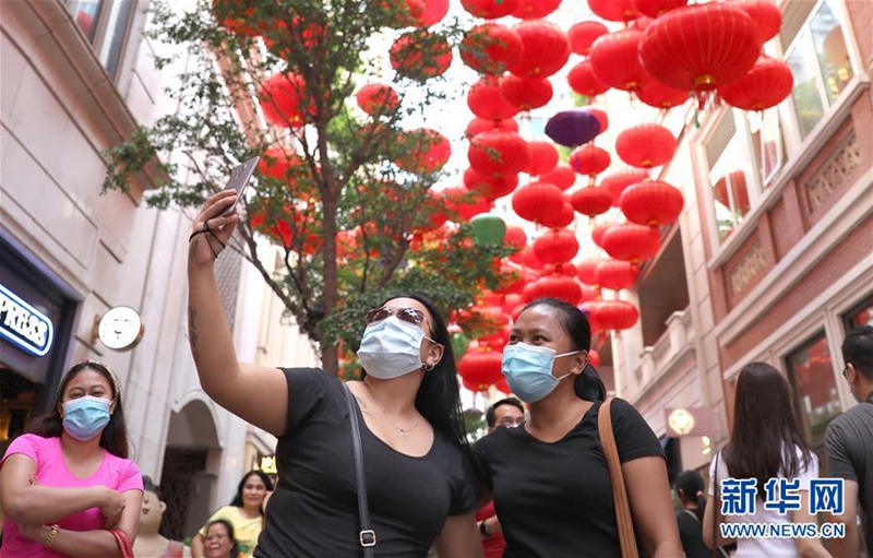10月2日,游客在香港利东街拍照。 为欢庆国庆和中秋佳节,香港利东街悬挂国旗和大红灯笼,喜庆气氛吸引不少游客前来游览拍照。 (新华社记者 吴晓初 摄)