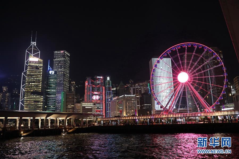 香港维港之滨的夜景(10月3日摄)。 国庆假期期间,香港维港夜色缤纷,歌声不断。 (新华社记者 吴晓初 摄)