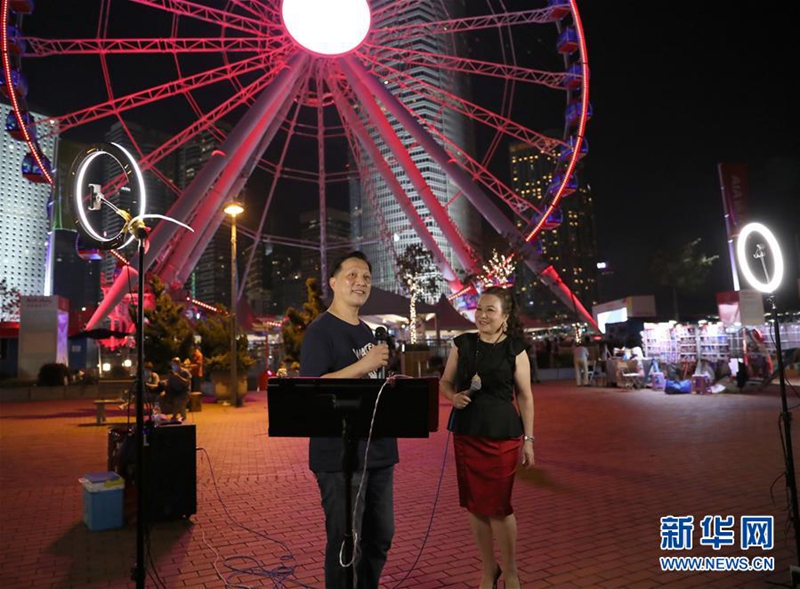 10月3日,在香港维港边的摩天轮下,两名演唱者在直播。 国庆假期期间,香港维港夜色缤纷,歌声不断。 (新华社记者 吴晓初 摄)