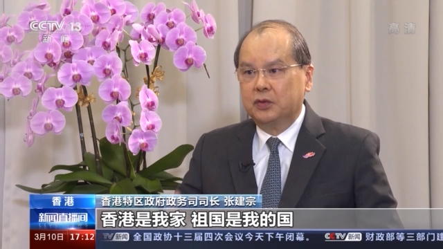 香港特区政府政务司司长 张建宗:香港是我家,祖国是我的国,我爱国同时爱港,爱国爱港是应有之义,是理所当然。“爱国者治港”是全面准确贯彻“一国两制”的落实,实践最基本的条件,同时就是要维护国家的主权、安全,让香港向前迈进,长治久安。