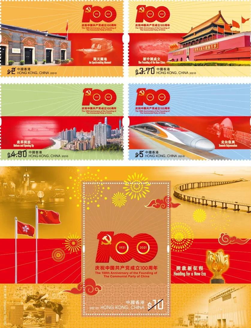 这套邮票及邮票小型张引用了中国共产党成立一百周年庆祝活动的唯一官方指定标识,包括将图案及主题名称用在邮票设计内,标识内56根光芒线寓意中国共产党奋进之光照耀中华大地。这套邮票还将光芒线延伸,在红红的党旗飘扬下串连四枚邮票的每一枚,分别展示党领导新中国成立和发展,实现为人民谋幸福、为民族谋复兴、为世界谋大同的目标。香港在中国共产党和中央政府的领导下,成功落实“一国两制”,作为特别行政区,香港得以维持繁荣安定,并融入国家发展的大局。