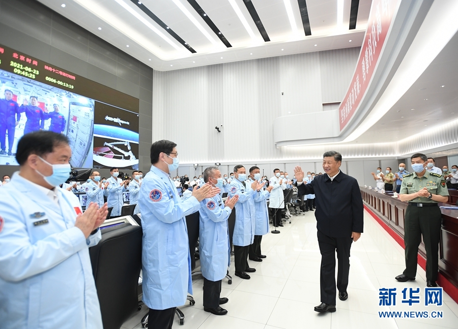 6月23日,中共中央总书记、国家主席、中央军委主席习近平来到北京航天飞行控制中心,同正在天和核心舱执行任务的神舟十二号航天员聂海胜、刘伯明、汤洪波亲切通话。这是通话结束后,习近平向他们挥手致意,向现场参试人员表示慰问。(新华社记者 燕雁 摄)