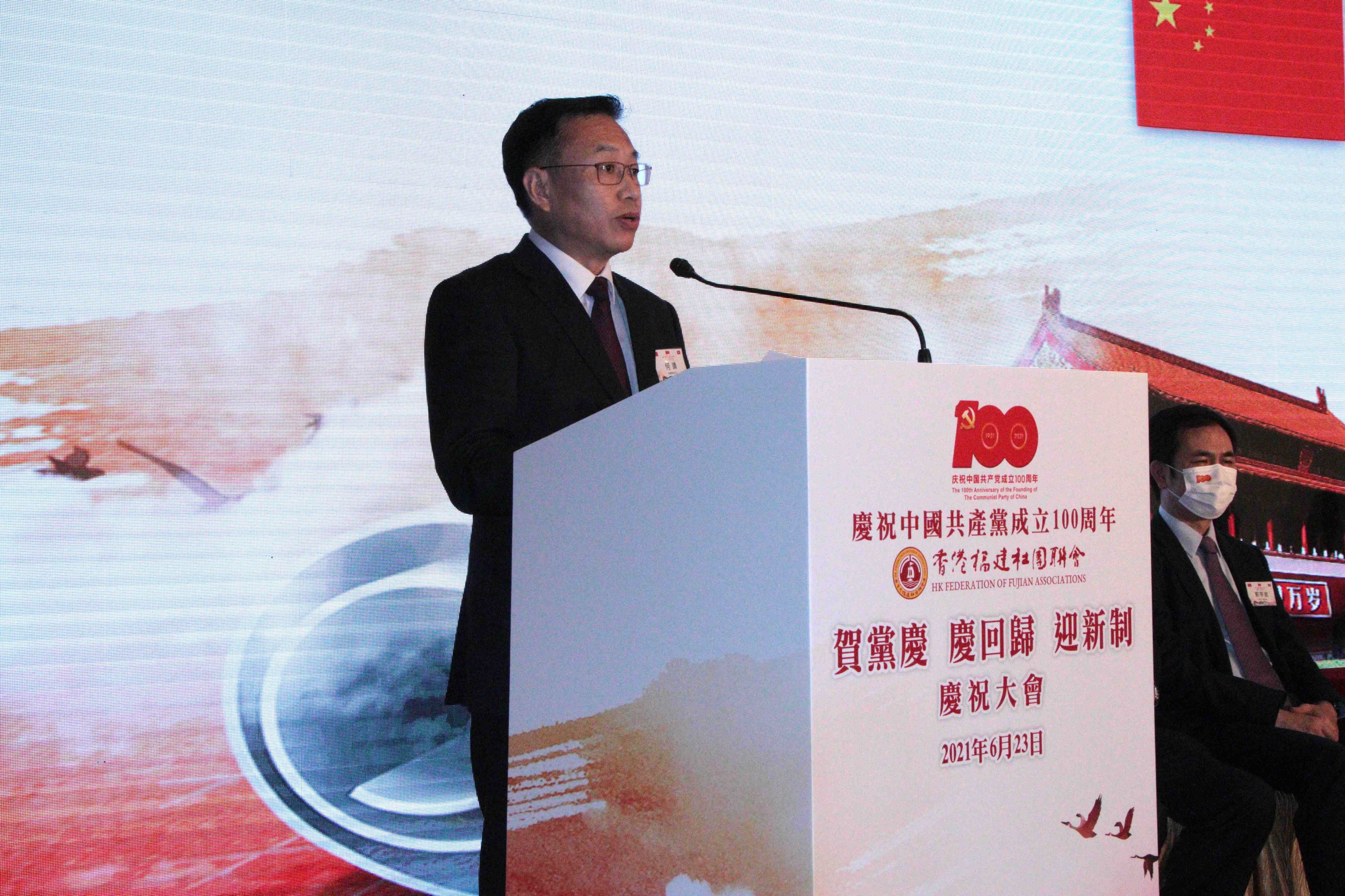 本网讯 6月23日,我办副主任何靖应邀出席香港福建社团联会“贺党庆 庆回归 迎新制”庆祝大会并致辞。香港特区行政长官林郑月娥出席并致辞,外交部驻港特派员公署特派员刘光源,驻港国安公署联络局局长邓建伟,特区政府保安局局长李家超、警务处处长邓炳强等一同出席。