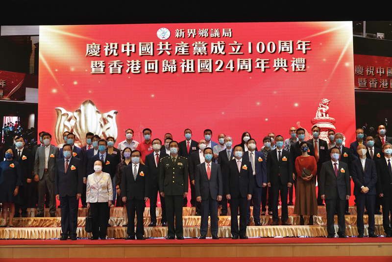 本网讯 6月25日,我办副主任何靖应邀出席新界乡议局庆祝中国共产党成立100周年暨香港回归祖国24周年典礼,并与解放军驻港部队副司令员郑国跃、外交部驻港公署副特派员方建明、新界乡议局主席刘业强等共同主礼。