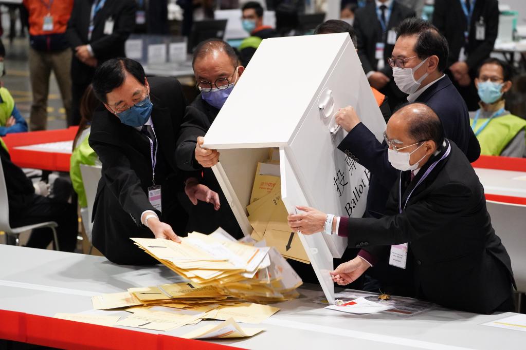 12月19日,香港特区选举管理委员会主席冯骅(右二)打开票箱。(新华社记者 吕小炜 摄)