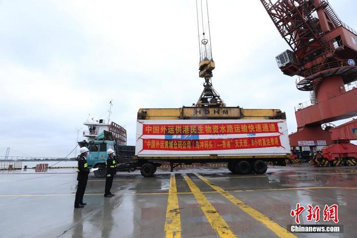 2月21日,在黄埔海关所属老港海关的监管下,一批装载着速冻食品等民生物资的集装箱在中国外运黄埔仓码公司吊装上船发往香港,标志着中国外运“黄埔—香港”供港民生物资水路运输快速通道正式开通。